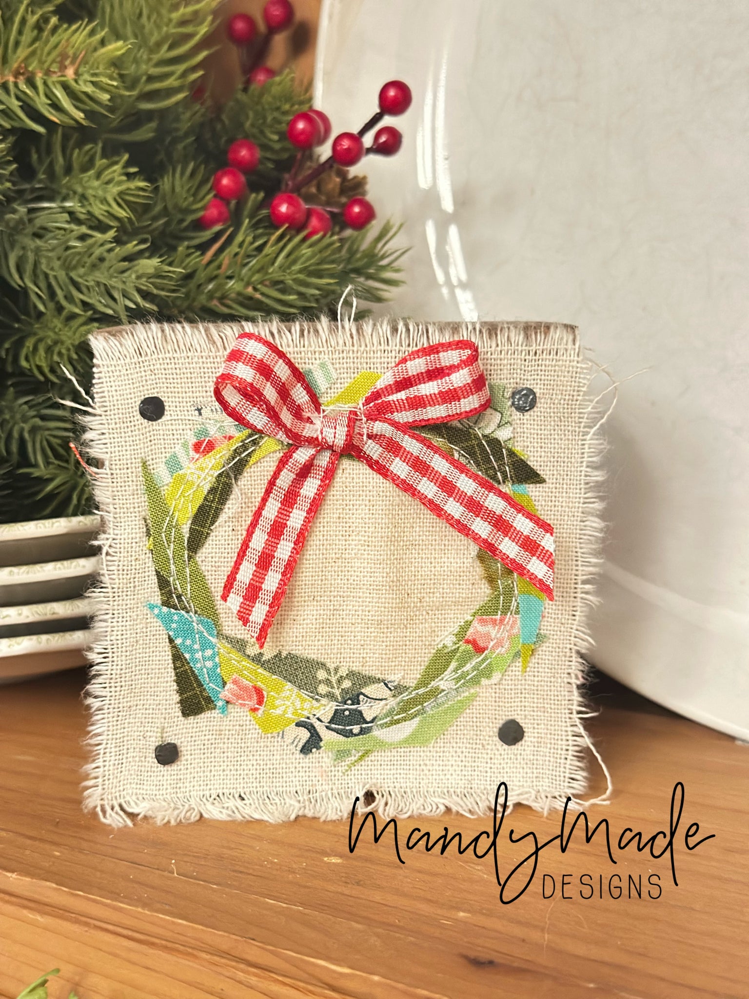 Another MandyMade Original! This wreath is made from tiny pieces of the prettiest green fabrics! Each piece has been hand cut and individually placed to create this beautiful Winter wreath.