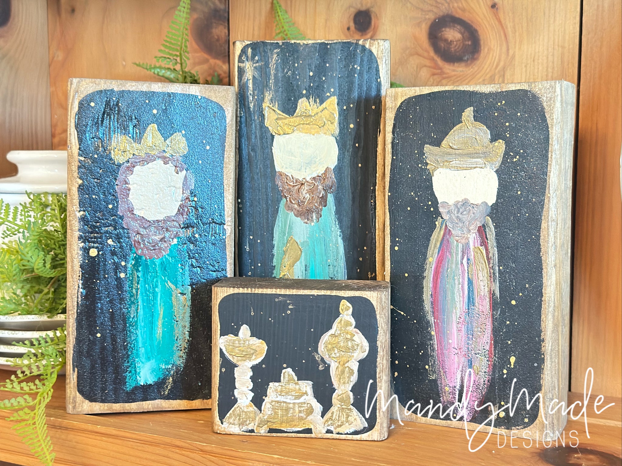 All hand painted and accented with gold foil, these whimsical paintings are representative of the guiding star that lead the wisemen into Bethlehem and the gifts they brought to acknowledge Baby Jesus’ birth.